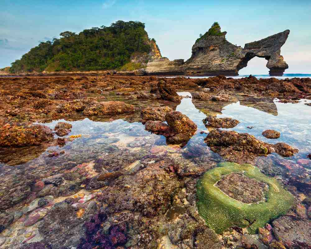 Angel's Billabong is actually a basin on the shoreline between rock formations where the water fills up at high tide and when the sea water recedes leaving a small pool that looks like the famous surf brand "Billabong", so this place is called "Angel Billabong".